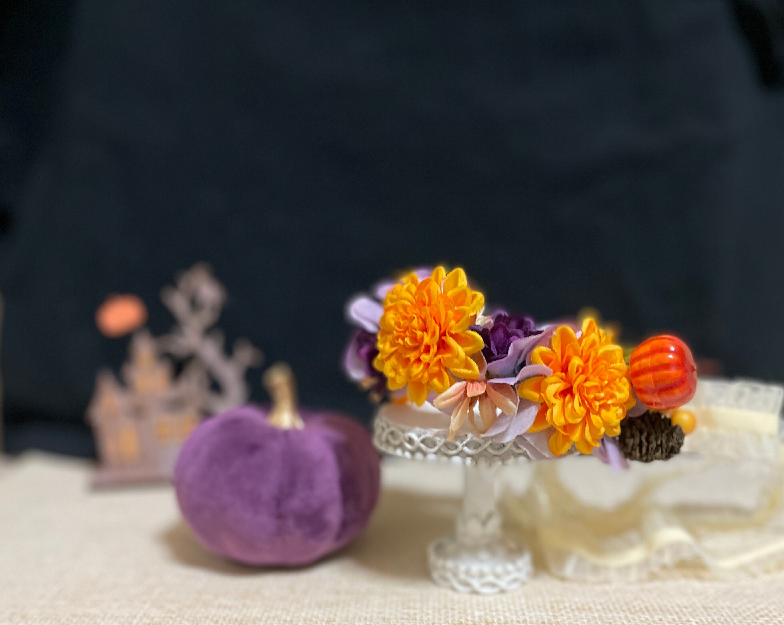 お散歩には向きませんが、お家の中を賑やかに飾るインテリアとしても大活躍します。愛らしいハロウィン気分を盛り上げるお花かんむりをぜひお試しください。